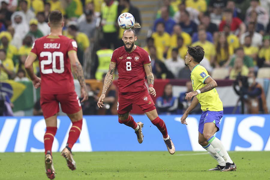 Nemanja Gudelj (c), de Serbia, cabecea el balón durante el partido del Grupo G entre Brasil y Serbia en la Copa Mundial de la FIFA 2022 en el Estadio Lusail, en Lusail, Qatar, el 24 de noviembre de 2022. (Xinhua/Xu Zijian)