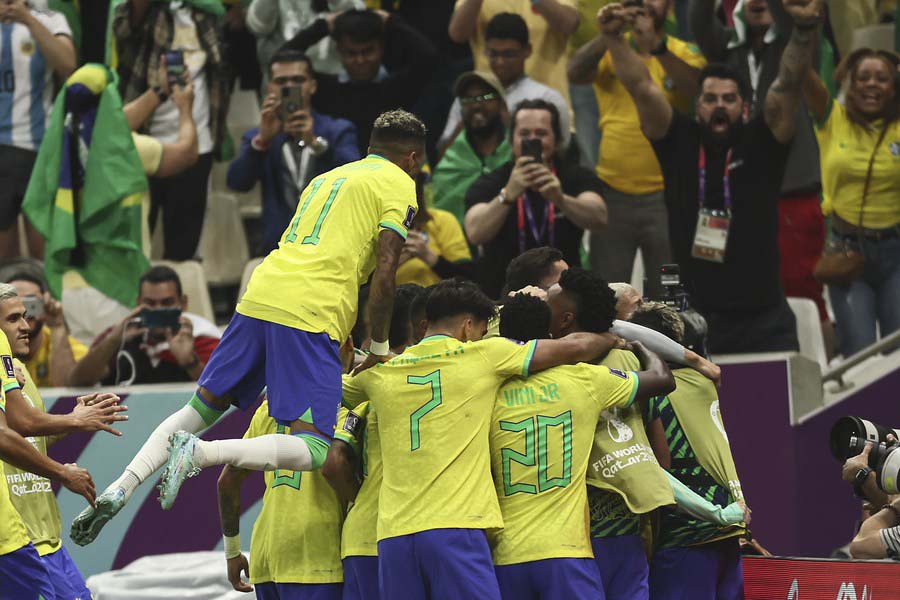 Jugadores de Brasil festejan una anotación durante el partido correspondiente al Grupo G, entre Brasil y Serbia, en la Copa Mundial de la FIFA 2022 en el Estadio Lusail, en Lusail, Qatar, el 24 de noviembre de 2022. (Xinhua/Lan Hongguang)