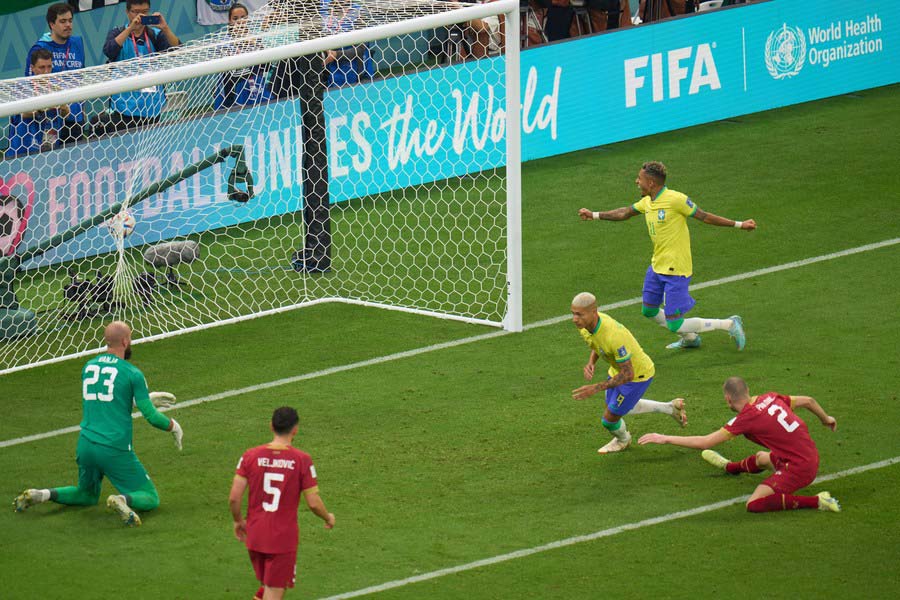 Richarlison (i) de Brasil realiza una anotación durante el partido correspondiente al Grupo G, entre Brasil y Serbia, en la Copa Mundial de la FIFA 2022 en el Estadio Lusail, en Lusail, Qatar, el 24 de noviembre de 2022. (Xinhua/Lan Hongguang)