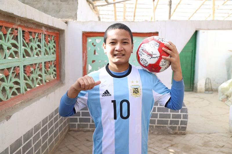 Abdulhalik Almdullah, de 14 a?os, viste la camiseta que le dio Messi y sostiene el balón que le dio. (Foto cortesía del Departamento de Propaganda de Kashgar)