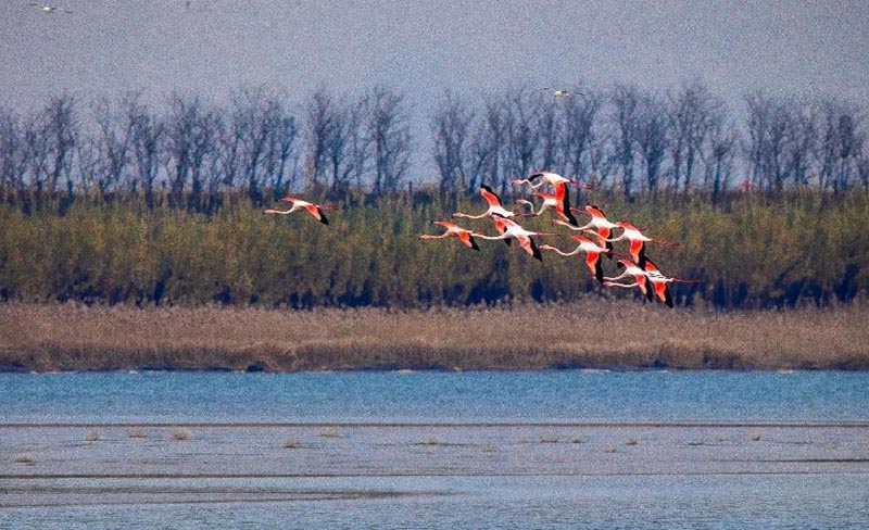 El 15 de diciembre de 2022, en el humedal de Tiaozini en Dongtai, provincia de Jiangsu, una bandada de flamencos sobrevuela el humedal. (Foto: Sun Jialu/Pueblo en Línea)