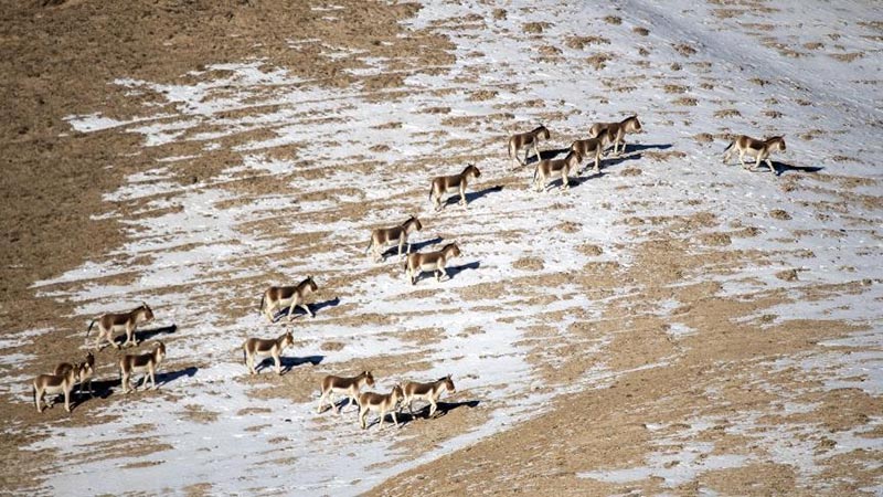 Un grupo de burros salvajes tibetanos en la meseta de Halten en el condado autónomo kazajo de Aksay, provincia de Gansu,el 17 de diciembre de 2022. (Foto:Gao Hongshan/Pueblo en Línea)