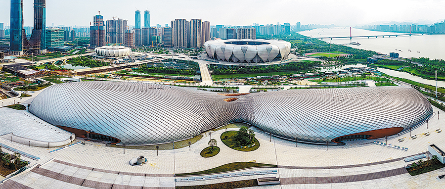 El Centro Deportivo Olímpico de Hangzhou, el sitio principal de los Juegos Asiáticos 2022, cuenta con una impresionante edificación en forma de mariposa que incorpora un natatorio y un gimnasio para albergar eventos de natación, buceo y baloncesto. [Foto: proporcionada a China Daily]