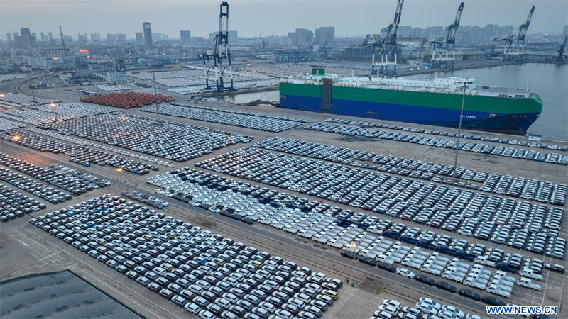 YANTAI, 19 enero, 2023 (Xinhua) -- Vista aérea del 18 de enero de 2023 de vehículos esperando ser embarcados en el puerto de Yantai, en Yantai, en la provincia de Shandong, en el este de China. El puerto está experimentando días atareados previo al próximo Festival de la Primavera ya que un gran número de vehículos a la espera de ser embarcados ocupan su terminal de carga y descarga. (Xinhua/Zhu Zheng)