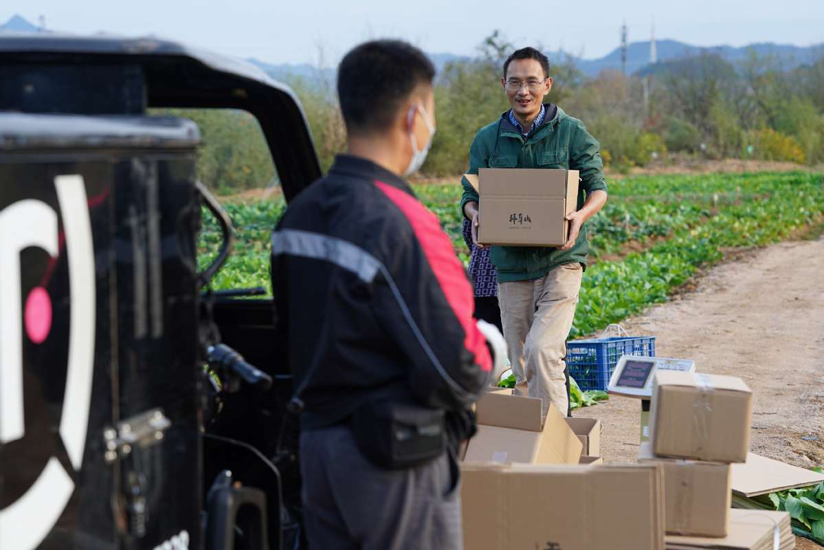 Zheng Tao entrega verduras envasadas a un repartidor en la ciudad de Huangshan, provincia de Anhui, el 24 de noviembre de 2022. [Foto/Xinhua]