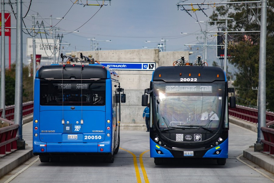 Imagen del 11 de septiembre de 2022 de unidades de trolebús durante el inicio del período de pruebas del trolebús elevado de unidades provenientes de China, en la Ciudad de México, capital de México. (Xinhua/Francisco Ca?edo)