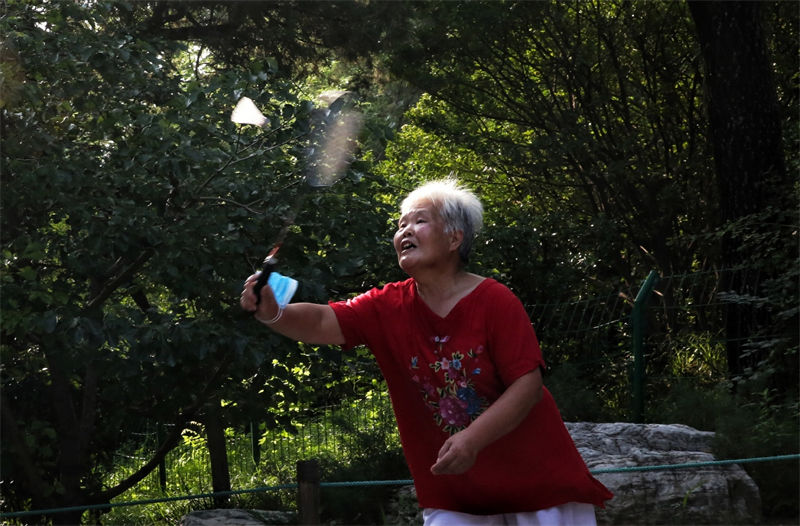 Anciana juega bádminton en el Parque Jingshan de Beijing, 20 de julio del 2020. [Foto: Jiang Dong / China Daily]