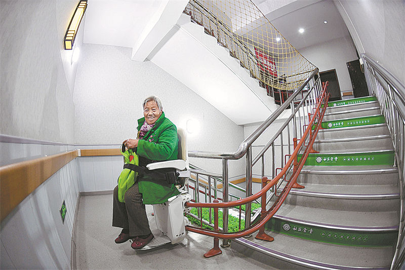 Una mujer da un paseo en una silla salvaescaleras en el centro de atención para ancianos Binhe en la ciudad de Taiyuan. Gracias a este dispositivo, los residentes son libres de entrar y salir cuando quieran. [Foto: Mi Guowei/China Daily]