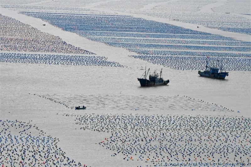 Pescadores conducen botes para operaciones de cría en una granja marina en el condado Lianjiang, Fuzhou, provincia de Fujian, sureste de China. (Foto de Wang Wangwang/ Pueblo en Línea)