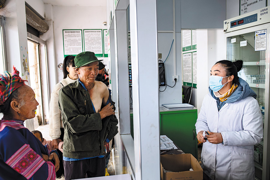 La gente consulta a Yang Lianying en la clínica de vacunación en la prefectura autónoma Hani e Yi de Honghe, provincia de Yunnan. [FOTO DE SUN REN/ CHINA DAILY]