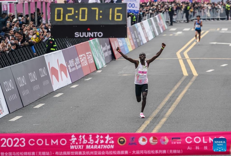 Enock Onchari de Kenia celebra su marca durante la competencia masculina en el Maratón de Wuxi 2023 en Wuxi, provincia de Jiangsu, en el este de China, el 19 de marzo de 2023. (Xinhua/Yang Lei)
