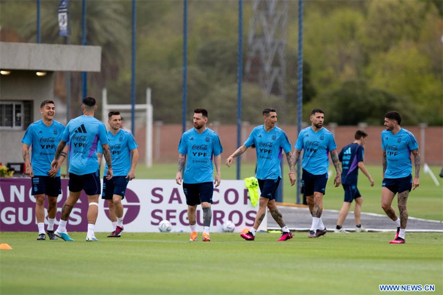 Jugadores de la selección argentina de fútbol participan en una sesión de entrenamiento en el predio de la Asociación Argentina de Fútbol, en la ciudad de Ezeiza, Argentina, el 21 de marzo de 2023. (Xinhua/Martín Zabala)