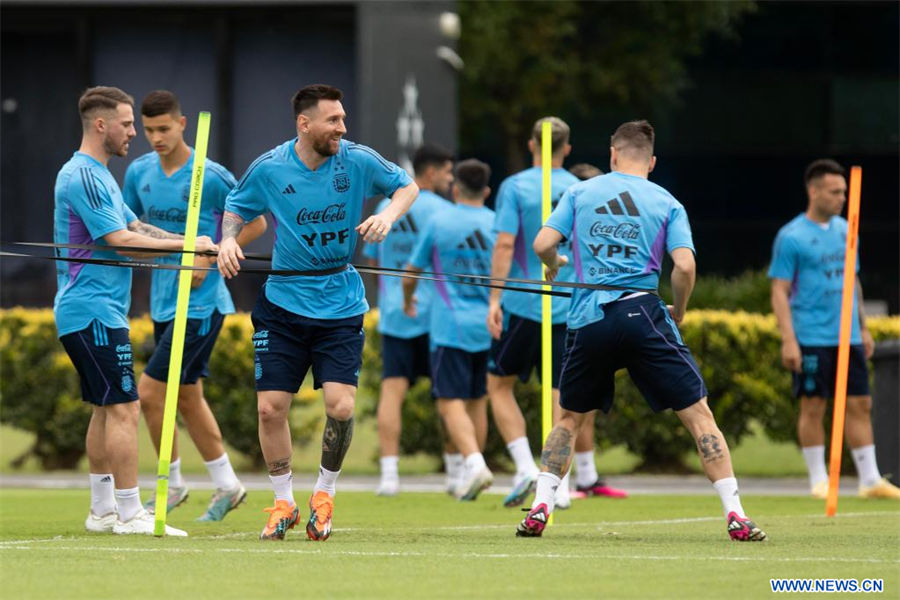 El jugador de la selección argentina de fútbol, Lionel Messi (c), participa en una sesión de entrenamiento en el predio de la Asociación Argentina de Fútbol, en la ciudad de Ezeiza, Argentina, el 21 de marzo de 2023. (Xinhua/Martín Zabala)