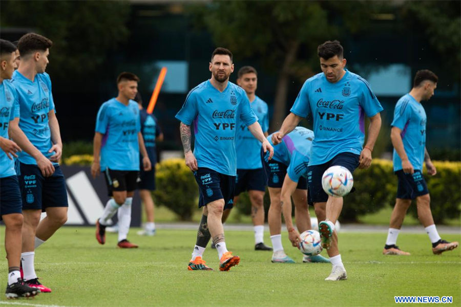 El jugador de la selección argentina de fútbol, Lionel Messi (c), participa en una sesión de entrenamiento en el predio de la Asociación Argentina de Fútbol, en la ciudad de Ezeiza, Argentina, el 21 de marzo de 2023. (Xinhua/Martín Zabala)