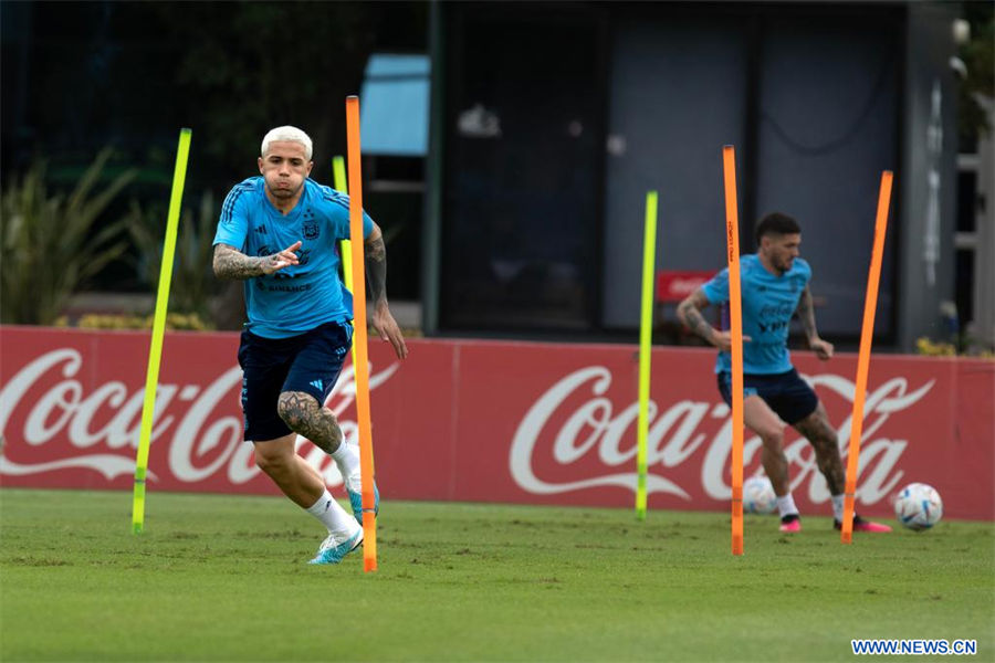 El jugador de la selección argentina de fútbol Enzo Fernández (i), participa en una sesión de entrenamiento en el predio de la Asociación Argentina de Fútbol, en la ciudad de Ezeiza, Argentina, el 21 de marzo de 2023. (Xinhua/Martín Zabala)