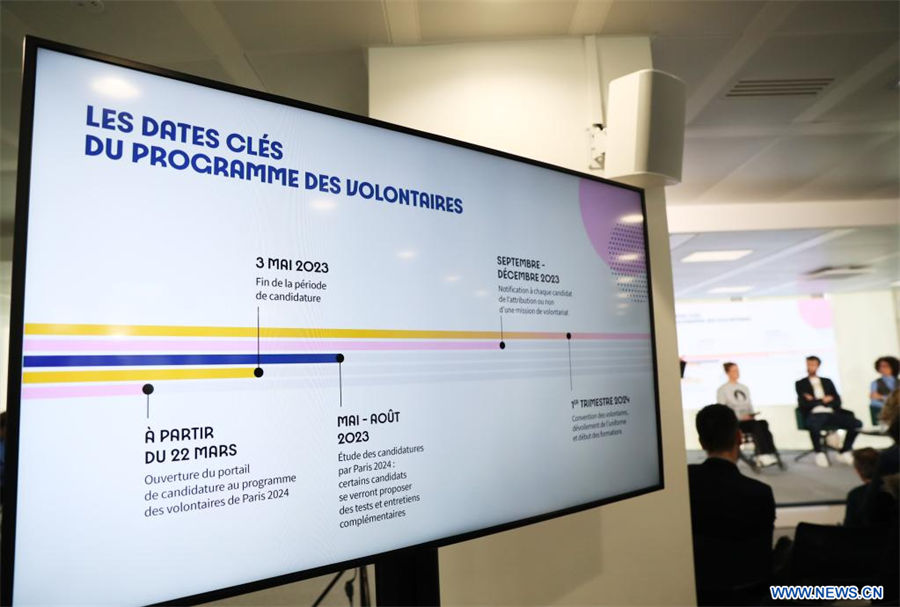 Una pantalla de televisión muestra la línea de tiempo del programa de voluntarios de los Juegos Olímpicos y Paralímpicos de París 2024 durante una conferencia de prensa, en Saint-Denis, Francia, el 21 de marzo de 2023. (Xinhua/Gao Jing)