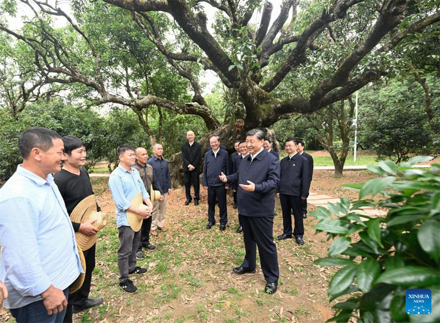 En la aldea, Xi visitó un huerto de lichi y una cooperativa que cultiva este fruto y el longan para conocer sobre los esfuerzos locales para desarrollar la industria de plantación distintiva y avanzar en la revitalización rural.