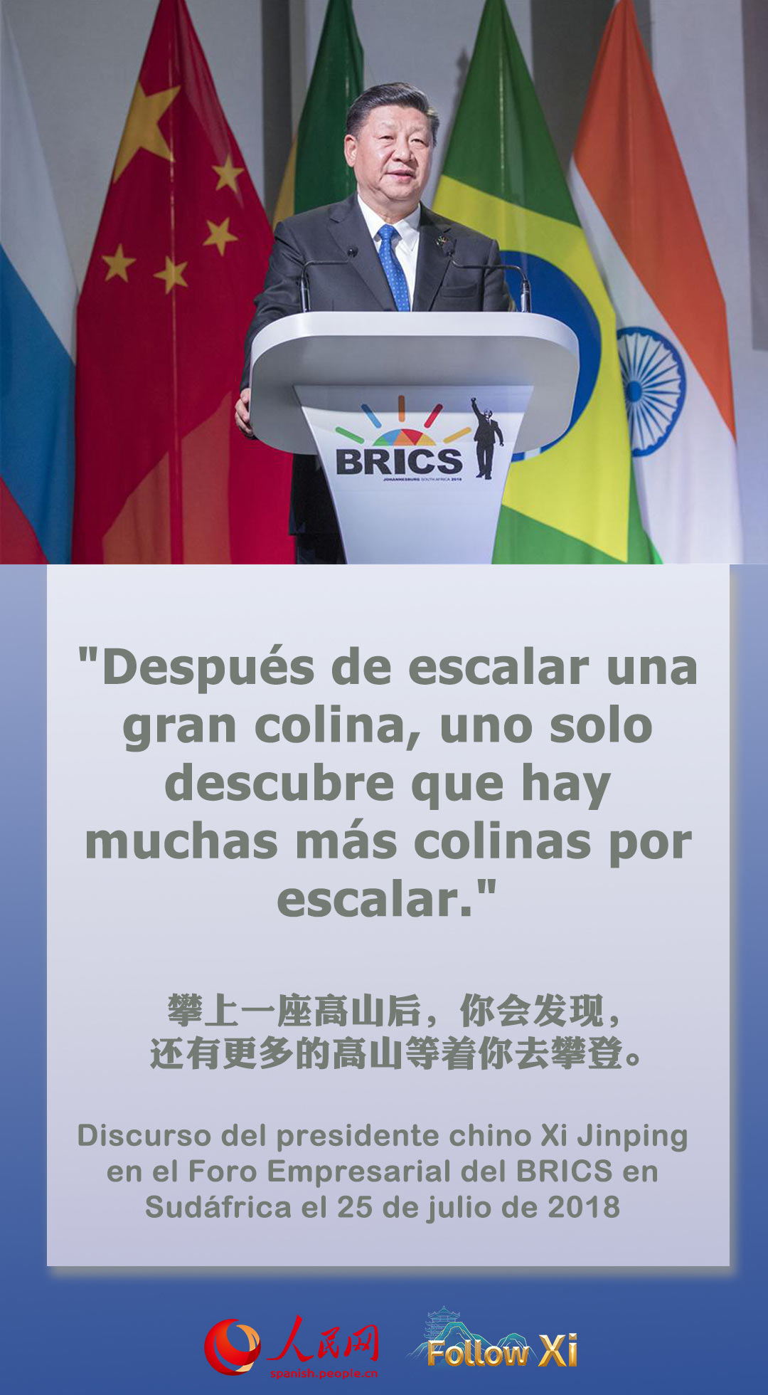 Este a?o se conmemora el centenario del nacimiento de Nelson Mandela. Permítanme citar uno de sus famosos refranes: “Después de escalar una gran colina, uno solo descubre que hay muchas más colinas por escalar”. De hecho, la historia de la cooperación BRICS es un viaje de nuestros cinco países escalando grandes colinas solo para alcanzar nuevas alturas. Estoy convencido de que cuando nuestros cinco países avancen juntos, escalaremos nuevos picos, alcanzaremos nuevas alturas y haremos una contribución aún mayor a la paz y el desarrollo de la humanidad.