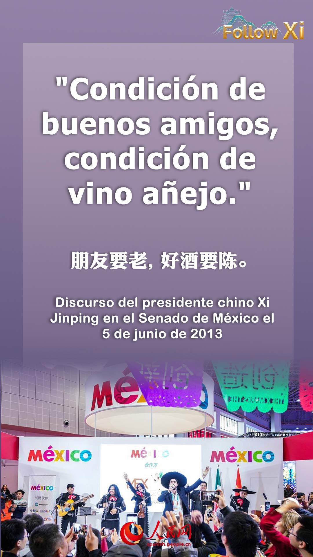 Hay un proverbio en América Latina, "Condición de buenos amigos, condición de vino a?ejo". La amistad entre China y México, que ha crecido de una generación a otra, es como una botella de tequila a?ejo, rebosante de una fragancia siempre fresca con el paso del tiempo.