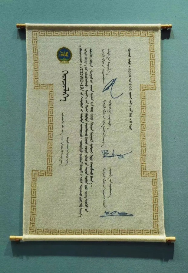 La foto muestra un pergamino presentado por Khaltmaa Battulga, entonces presidente de Mongolia, al presidente chino Xi Jinping en febrero de 2020 como certificado por la donación de 30.000 ovejas de Mongolia a China para apoyar la lucha de China contra el COVID-19. (Foto/Hu Yang)
