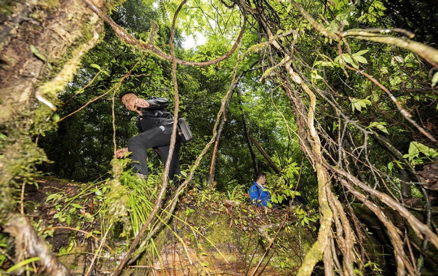 Miembros del personal caminan a través del bosque para llegar al ciprés gigante de 102,3 metros. 15 de junio de 2023. [Foto/Xinhua]