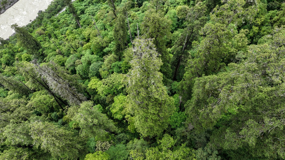 Foto aérea del 15 de junio de 2023 que muestra el ciprés gigante que mide 102,3 metros en la reserva natural nacional del Gran Ca?ón de Yarlung Zangbo en el distrito de Bome, ciudad de Nyingchi, región autónoma de Xizang, en el suroeste de China. [Foto/Xinhua]