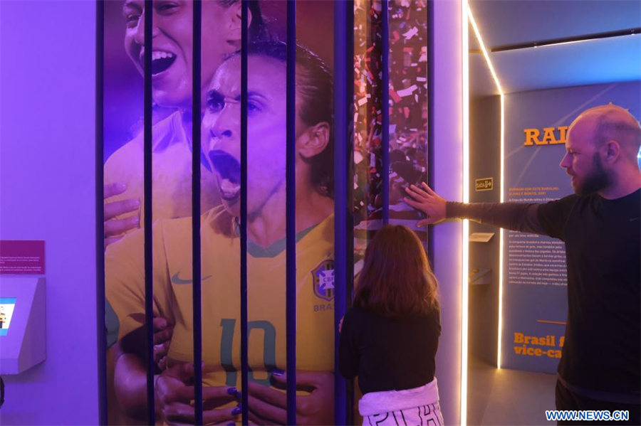Personas visitan la exposición "Rainhas de Copas", sobre la historia del fútbol femenino en Brasil, en el Museo del Fútbol, en Sao Paulo, Brasil, el 21 de julio de 2023. (Xinhua/Rahel Patrasso)