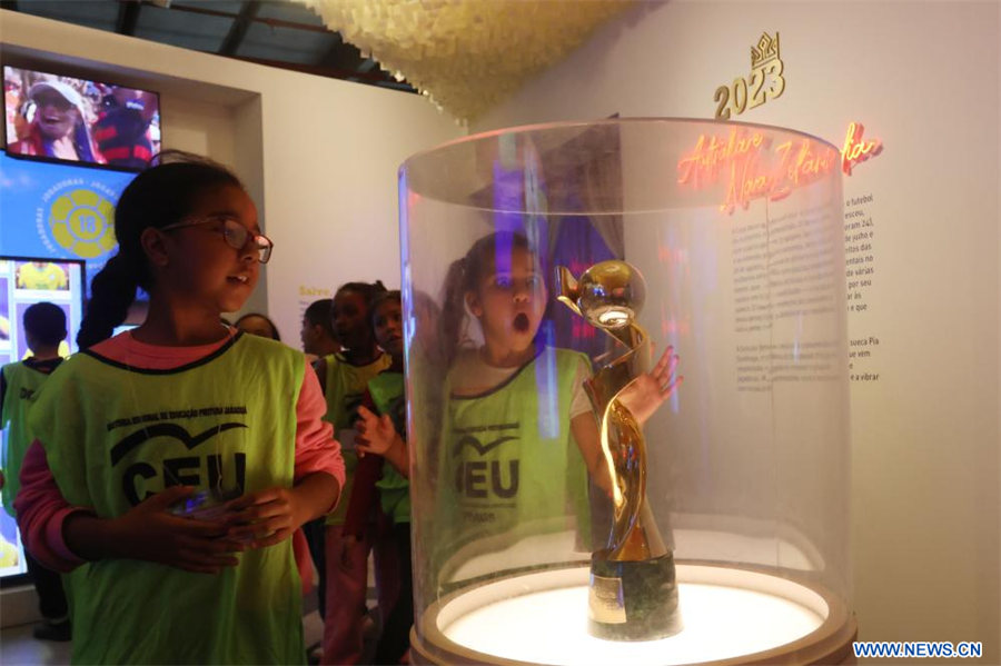 Dos ni?as observan una réplica del trofeo de la Copa Mundial Femenina de la FIFA Australia y Nueva Zelanda 2023 exhibido en la exposición "Rainhas de Copas", sobre la historia del fútbol femenino en Brasil, en el Museo del Fútbol, en Sao Paulo, Brasil, el 21 de julio de 2023. (Xinhua/Rahel Patrasso)