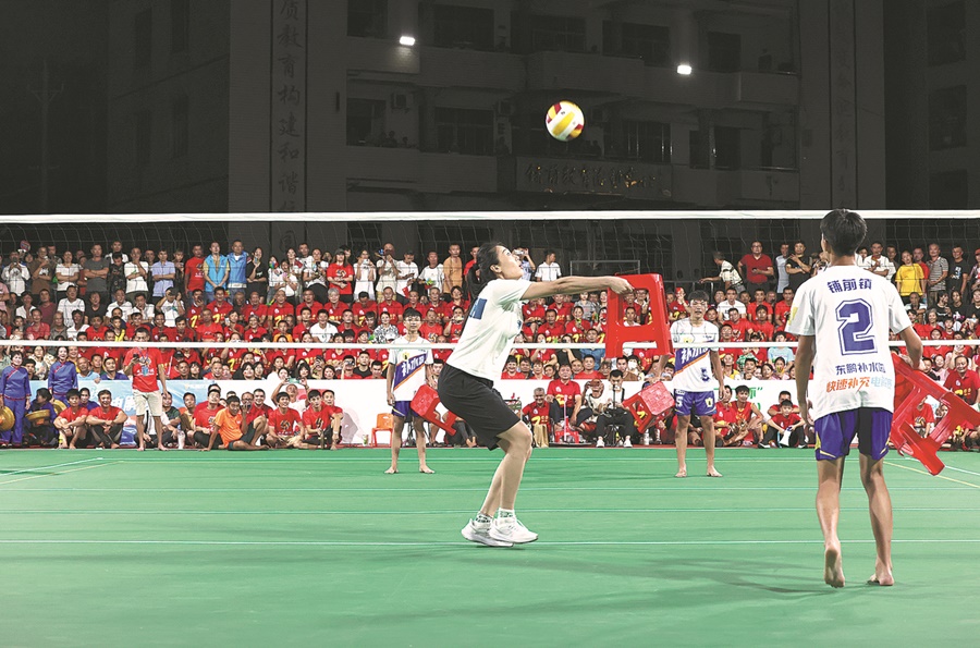 Liu Yanhan (a la izquierda), ex miembro del Equipo Nacional de Voleibol Femenino, juega con varios ni?os usando un taburete mientras calienta para un juego de la "Asociación de Voleibol de Aldea" en Wenchang, provincia de Hainan, 21 de julio del 2023. (Foto: Zhu Xingxin/ China Daily)