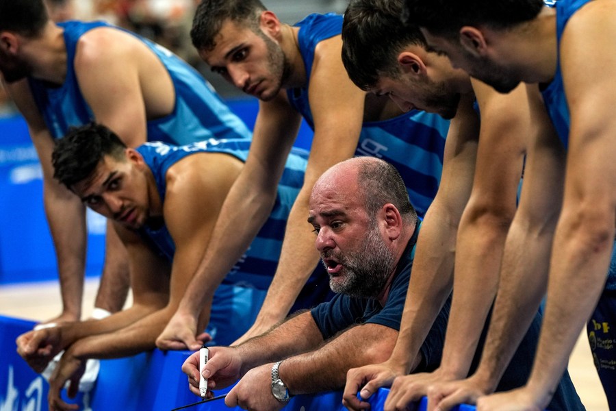 El director técnico Mauricio Santangelo (c), de Argentina, conversa con jugadores durante el partido de baloncesto masculino de la ronda preliminar del grupo B entre Argentina y Rumania en la 31a edición de verano de los Juegos Mundiales Universitarios de la FISU, en Chengdu, en la provincia de Sichuan, en el suroeste de China, el 30 de julio de 2023. (Xinhua/Hu Chao)
