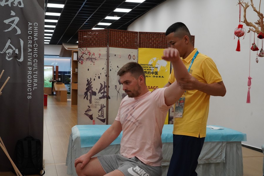 Imagen del 2 de agosto de 2023 de un atleta experimentando un masaje de medicina tradicional china en la Aldea de los Juegos de la FISU, en Chengdu, en la provincia de Sichuan, en el suroeste de China. (Xinhua/Tang Wenhao)