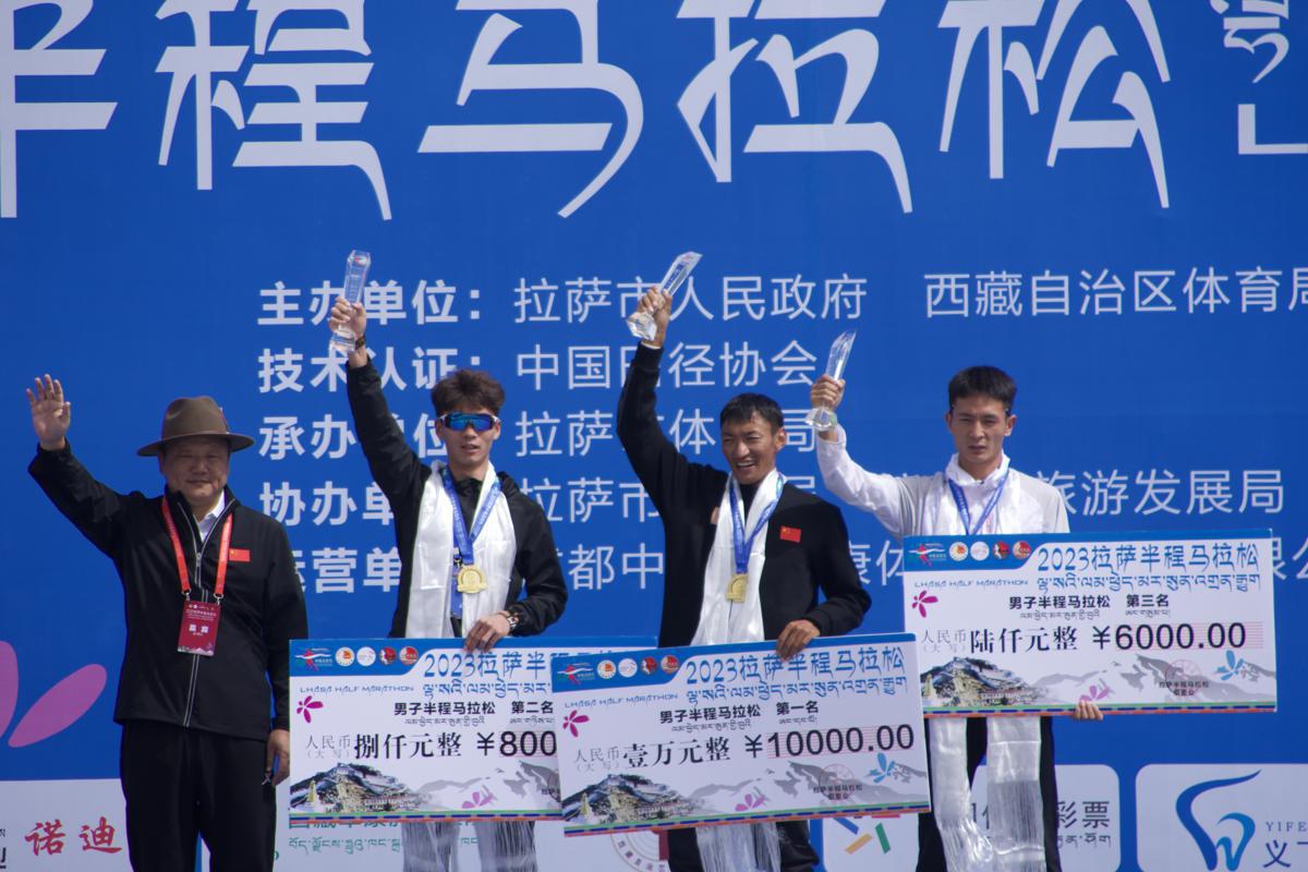 Los funcionarios entregan premios a los ganadores del medio maratón de Lhasa el domingo. [Foto de Dekyi Drolma/Para chinadaily.com.cn]