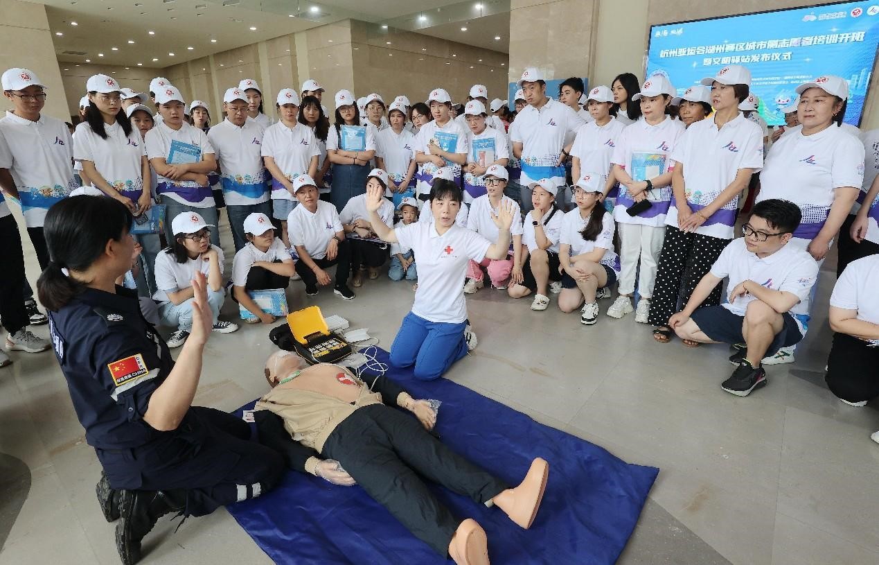 Expertos médicos instruyen a voluntarios para los Juegos Asiáticos de Hangzhou a realizar reanimación cardiopulmonar en el campus de Moganshan de la Universidad Tecnológica de Zhejiang, 23 de agosto de 2023. (Diario del Pueblo digital/Xie Shangguo)