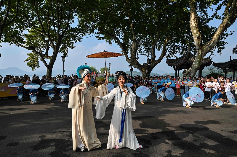 Los artistas participan en una actuación antes del inicio del relevo de la antorcha de los Juegos Asiáticos en Hangzhou, provincia de Zhejiang, el 8 de septiembre de 2023. (Foto: VCG)