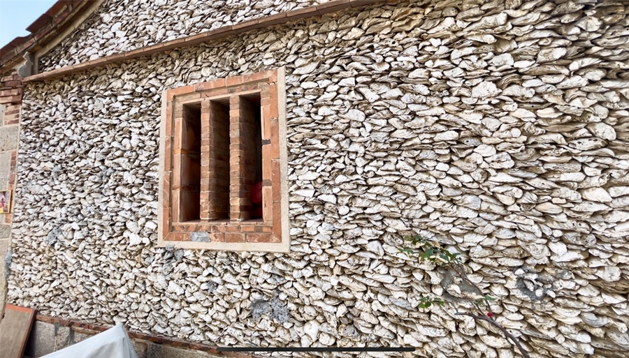 Las conchas de ostras en las paredes de las casas en la aldea de Xunpu son más grandes que las conchas de las ostras locales y provienen de la costa este de áfrica. Foto de Wang Jing, Diario del Pueblo digital.