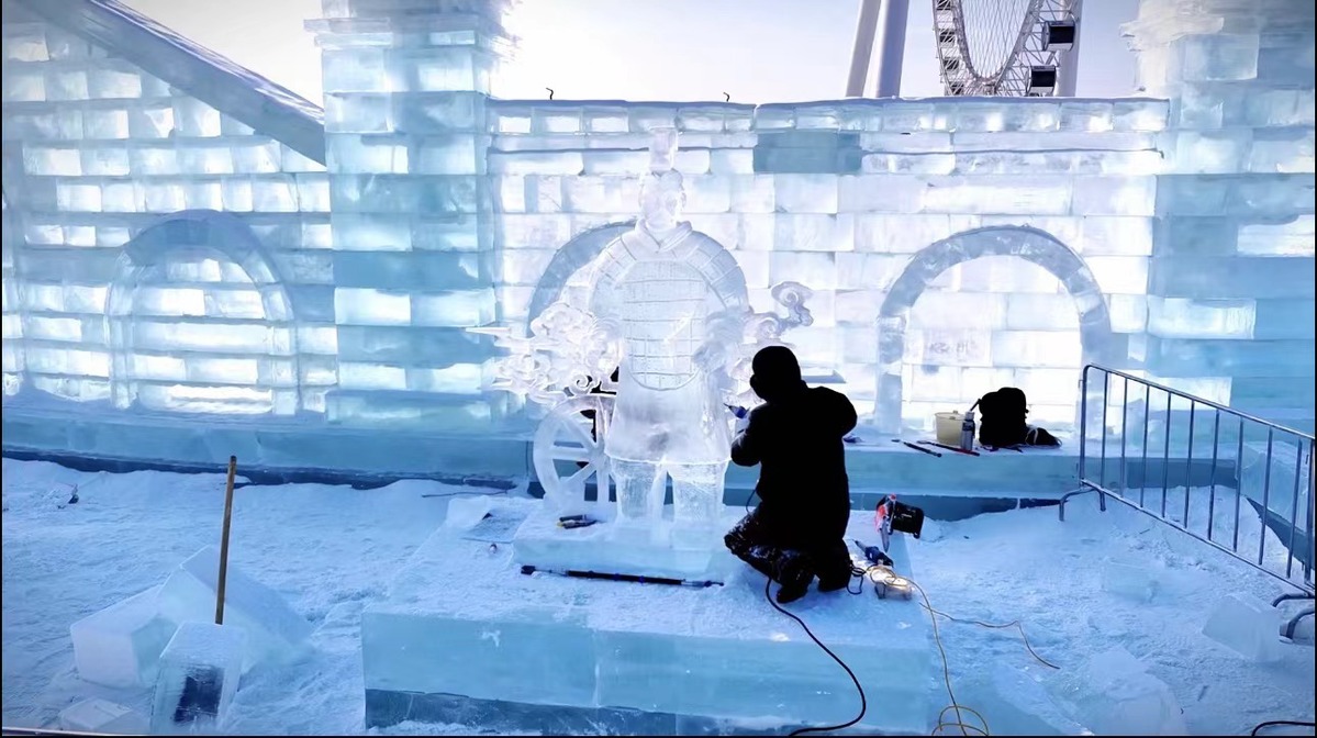 Un escultor crea un guerrero de terracota de hielo en el Mundo de Hielo y Nieve de Harbin, en Harbin, la capital de la provincia de Heilongjiang, en el noreste de China. [Foto proporcionada a chinadaily.com.cn]