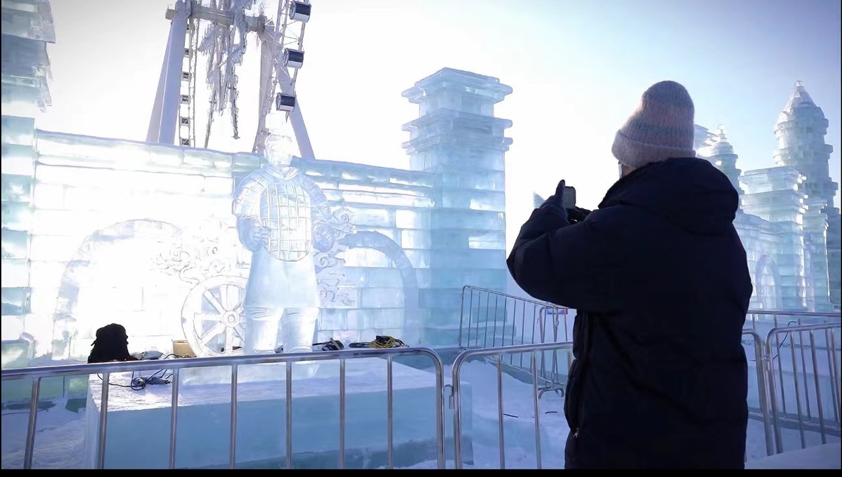 Un turista toma una fotografía de un guerrero de terracota de hielo en el Mundo de Hielo y Nieve de Harbin, en Harbin, la capital de la provincia de Heilongjiang, en el noreste de China. [Foto proporcionada a chinadaily.com.cn]