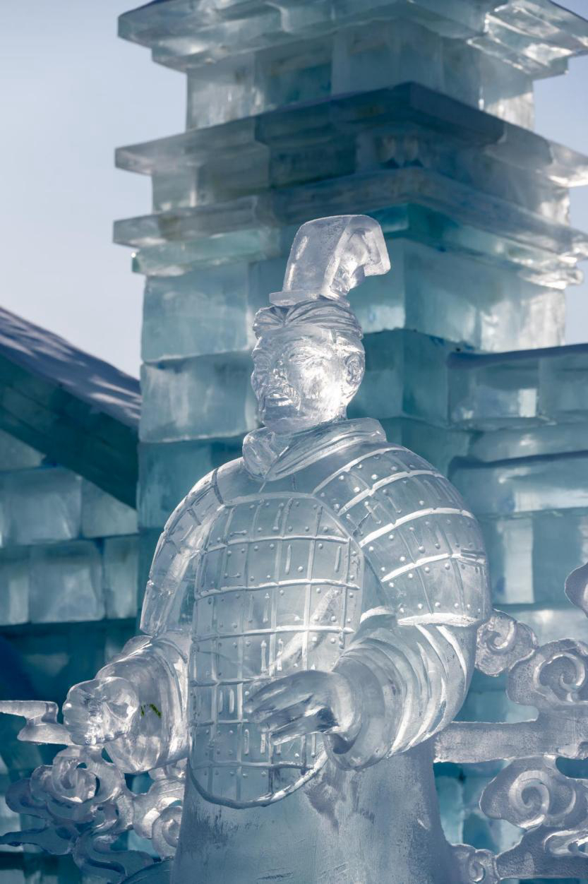 Una escultura de hielo de un guerrero de terracota se exhibe en el Mundo de Hielo y Nieve de Harbin en Harbin, la capital de la provincia de Heilongjiang, en el noreste de China. [Foto proporcionada a chinadaily.com.cn]