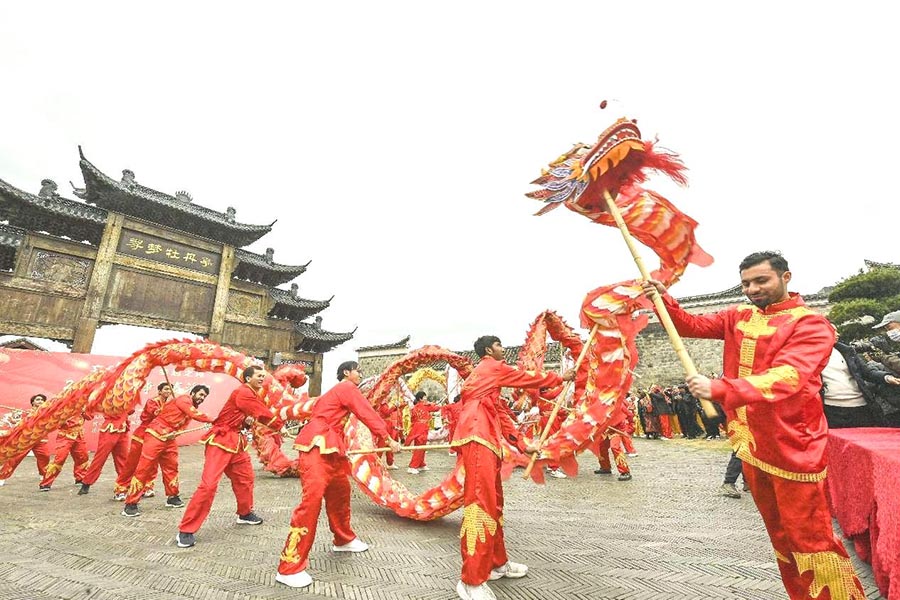 Estudiantes extranjeros de la Universidad de Nanchang participan en la danza del dragón durante la Fiesta de la Primavera en la provincia de Jiangxi. [Foto: Li Jie, Diario del Pueblo digital]