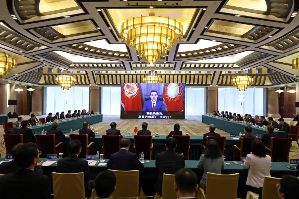 El presidente de Kirguistán, Sadyr Japarov, felicita a través de un enlace de video por la firma de un acuerdo intergubernamental, en Beijing, capital de China sobre el proyecto ferroviario China-Kirguistán-Uzbekistán, el 6 de junio de 2024. (Xinhua/Xing Guangli)
