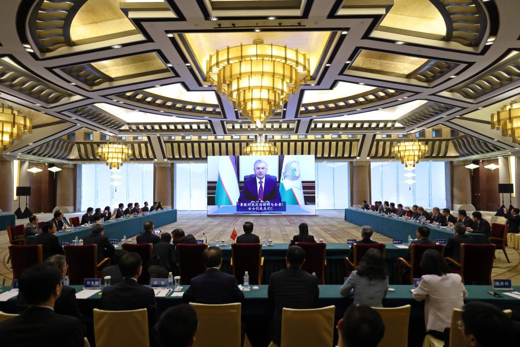 El presidente de Uzbekistán, Shavkat Mirziyoyev, felicita a través de un enlace de video por la firma de un acuerdo intergubernamental, en Beijing, capital de China sobre el proyecto ferroviario China-Kirguistán-Uzbekistán, el 6 de junio de 2024. (Xinhua/Xing Guangli)