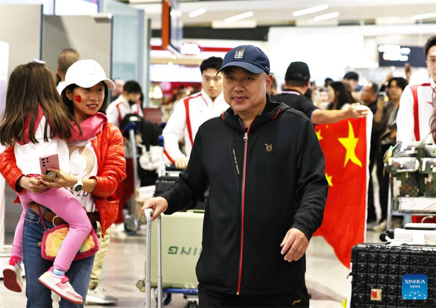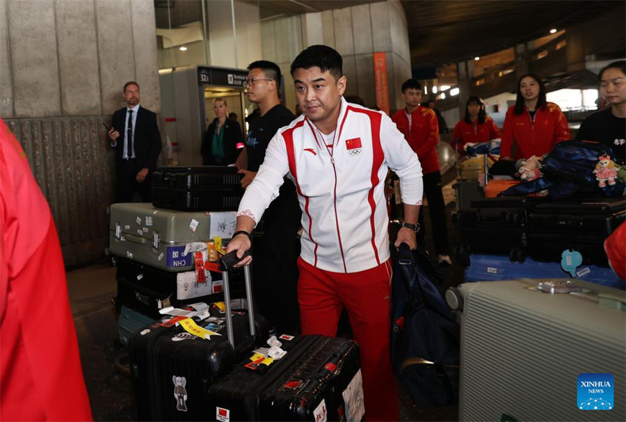 Liu Guoliang (frente), presidente de la Asociación de Tenis de Mesa, llega al Aeropuerto Roissy-Charles de Gaulle para los próximos Juegos Olímpicos de París 2024, cerca de París, Francia, el 15 de julio de 2024. (Xinhua/Gao Jing)