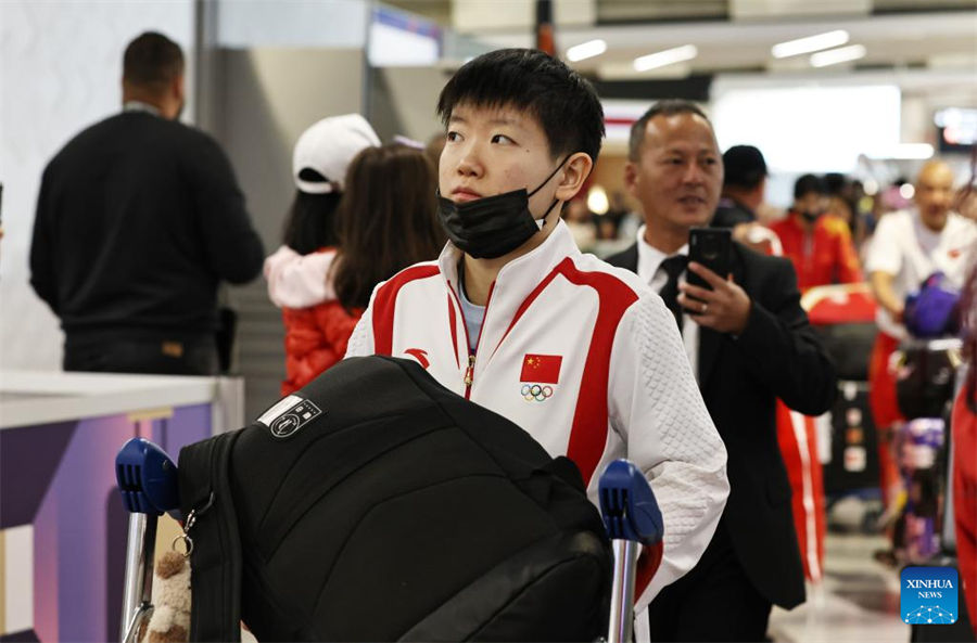 Sun Yingsha, del equipo chino de tenis de mesa, llega al Aeropuerto Roissy-Charles de Gaulle para los próximos Juegos Olímpicos de París 2024, cerca de París, Francia, el 15 de julio de 2024. (Xinhua/Gao Jing)