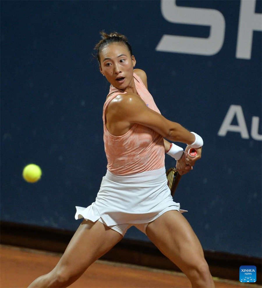 Imagen del 21 de julio de 2024 de Zheng Qinwen devolviendo la pelota durante el partido final entre Zheng Qinwen, de China, y Karolina Muchova, de la República Checa, en el 35o Abierto Femenino de Palermo, en Palermo, Italia. (Xinhua/Alberto Lingria)