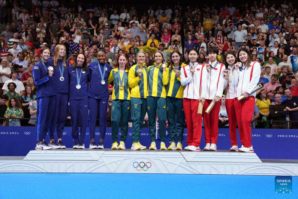 PARIS, 27 julio, 2024 (Xinhua) -- Las medallistas de oro equipo de Australia (c), las medallistas de plata equipo de Estados Unidos (i) y las medallistas de bronce equipo de China posan para una fotografía grupal durante la ceremonia de victoria de los relevos 4x100m estilo libre femenino de natación en los Juegos Olímpicos de París 2024, en París, Francia, el 27 de julio de 2024. (Xinhua/Du Yu) |
