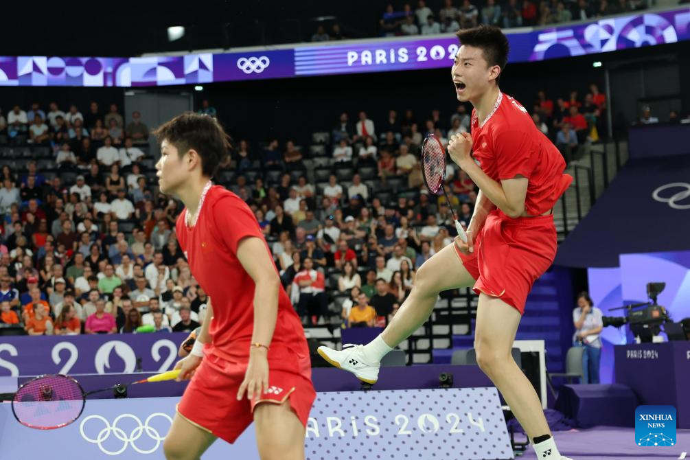 PARIS, 27 julio, 2024 (Xinhua) -- Feng Yanzhe (d)/Huang Dongping de China reaccionan durante el partido de dobles mixtos de la fase de grupos de bádminton ante Vinson Chiu/Jennie Gai de Estados Unidos en los Juegos Olímpicos de París 2024, en París, Francia, el 27 de julio de 2024. (Xinhua/Chen Bin) |