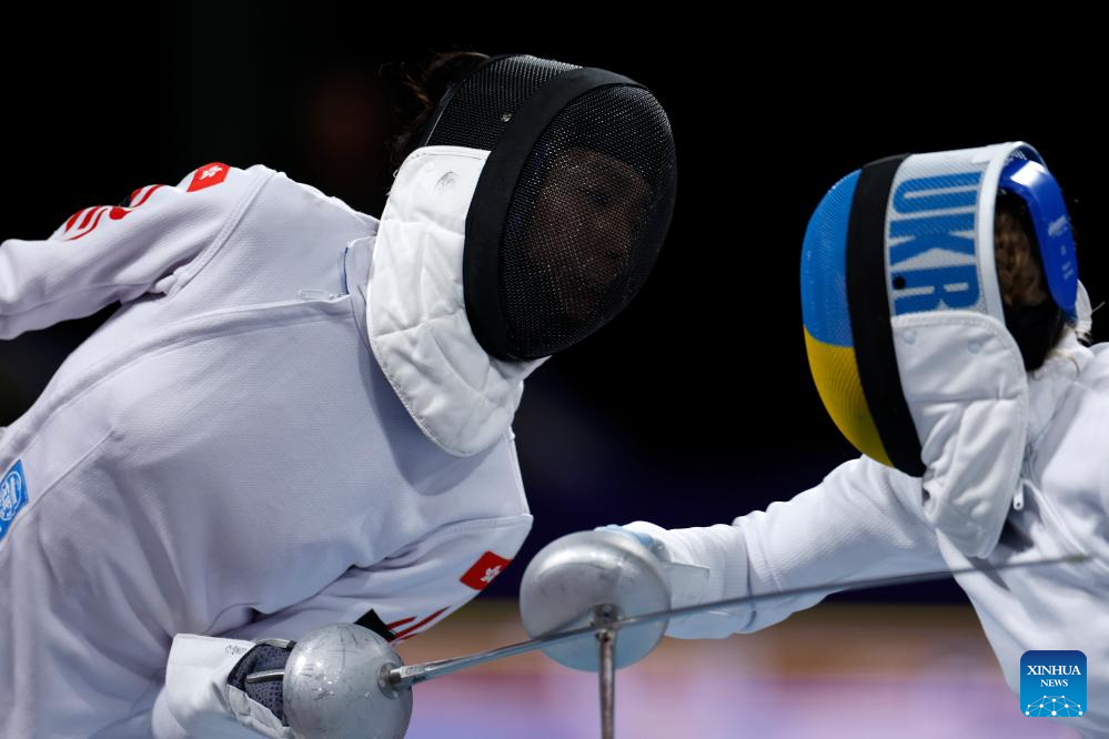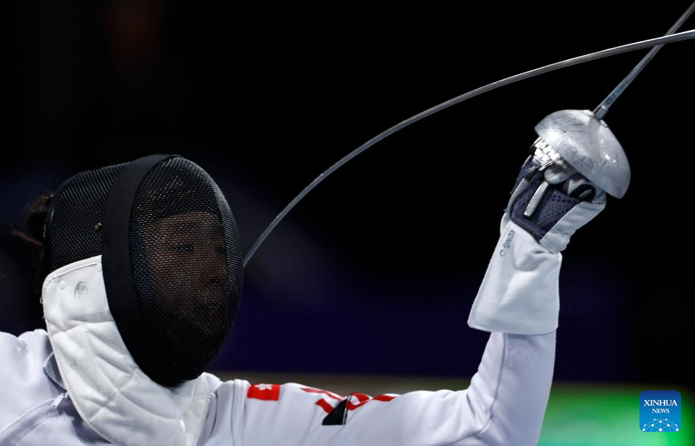 PARIS, 27 julio, 2024 (Xinhua) -- Vivian Kong Man Wai de Hong Kong de China compite con Olena Kryvytska (no aparece) de Ucrania durante la ronda de 8 de espada individual femenina en los Juegos Olímpicos de París 2024, en París, Francia, el 27 de julio de 2024. (Xinhua/Fei Maohua)
