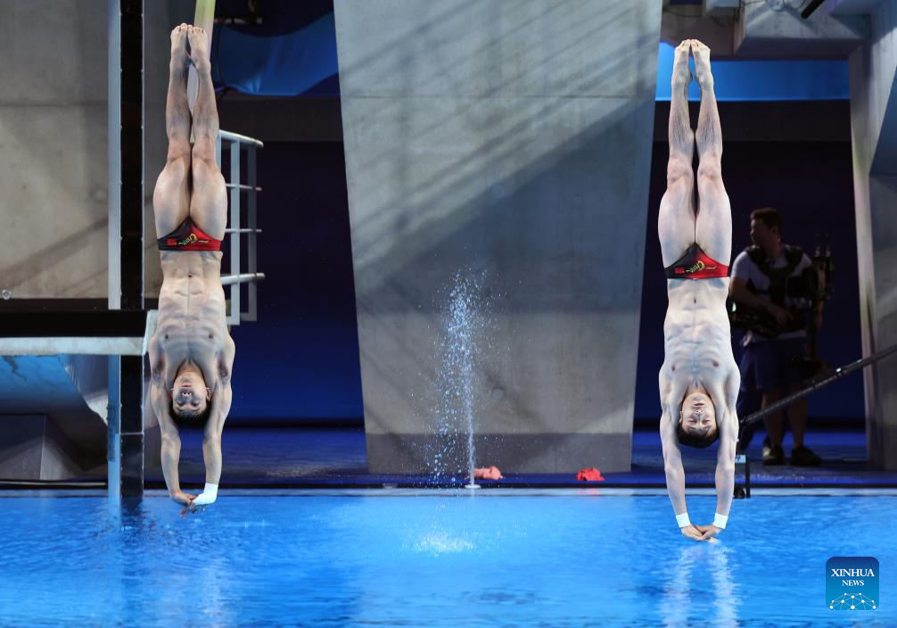 SAINT DENIS, 29 julio, 2024 (Xinhua) -- Lian Junjie/Yang Hao de China compiten durante la final de saltos sincronizados plataforma 10m masculino en los Juegos Olímpicos de París 2024, en Saint Denis, cerca de París, Francia, el 29 de julio de 2024. (Xinhua/Li Ying)