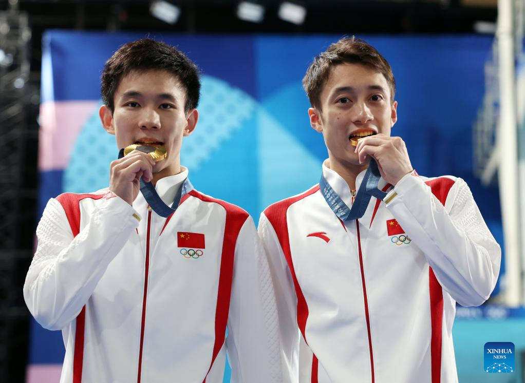 SAINT DENIS, 29 julio, 2024 (Xinhua) -- Lian Junjie (d)/Yang Hao de China asisten a la ceremonia de premiación al término de la final de saltos sincronizados plataforma 10m masculino en los Juegos Olímpicos de París 2024, en Saint Denis, cerca de París, Francia, el 29 de julio de 2024. (Xinhua/Li Ying)