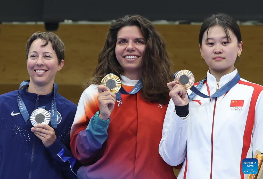 La medallista de oro Chiara Leone (c) de Suiza, la medallista de plata Sagen Maddalena (i) de Estados Unidos y la medallista de bronce Zhang Qiongyue de China asisten a la ceremonia de victoria al término de la final de 50 m rifle tres posiciones femenino de tiro en los Juegos Olímpicos de París 2024, en Chateauroux, Francia, el 2 de agosto de 2024. (Xinhua/Zhao Dingzhe)